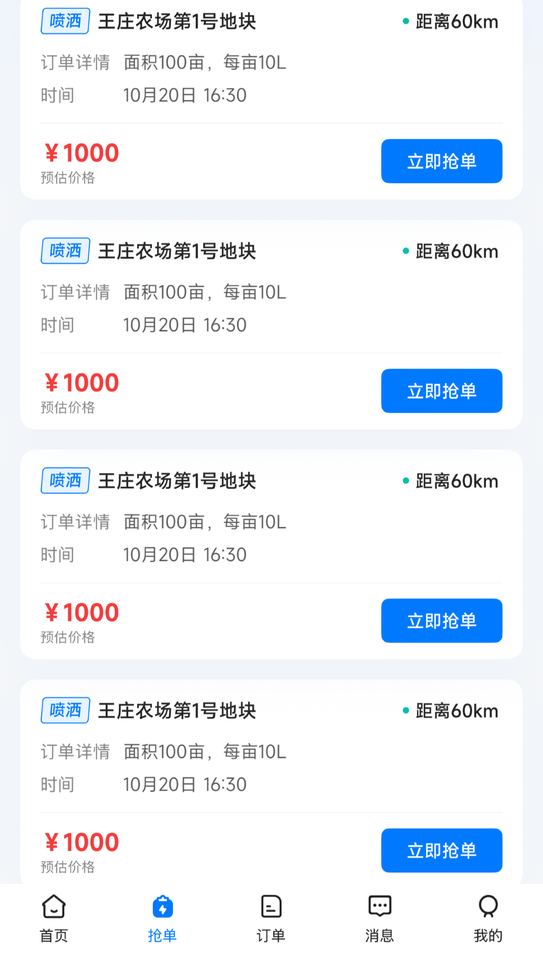接单中心:查看附近作业需求,按距离、价格排序,抢单或报价