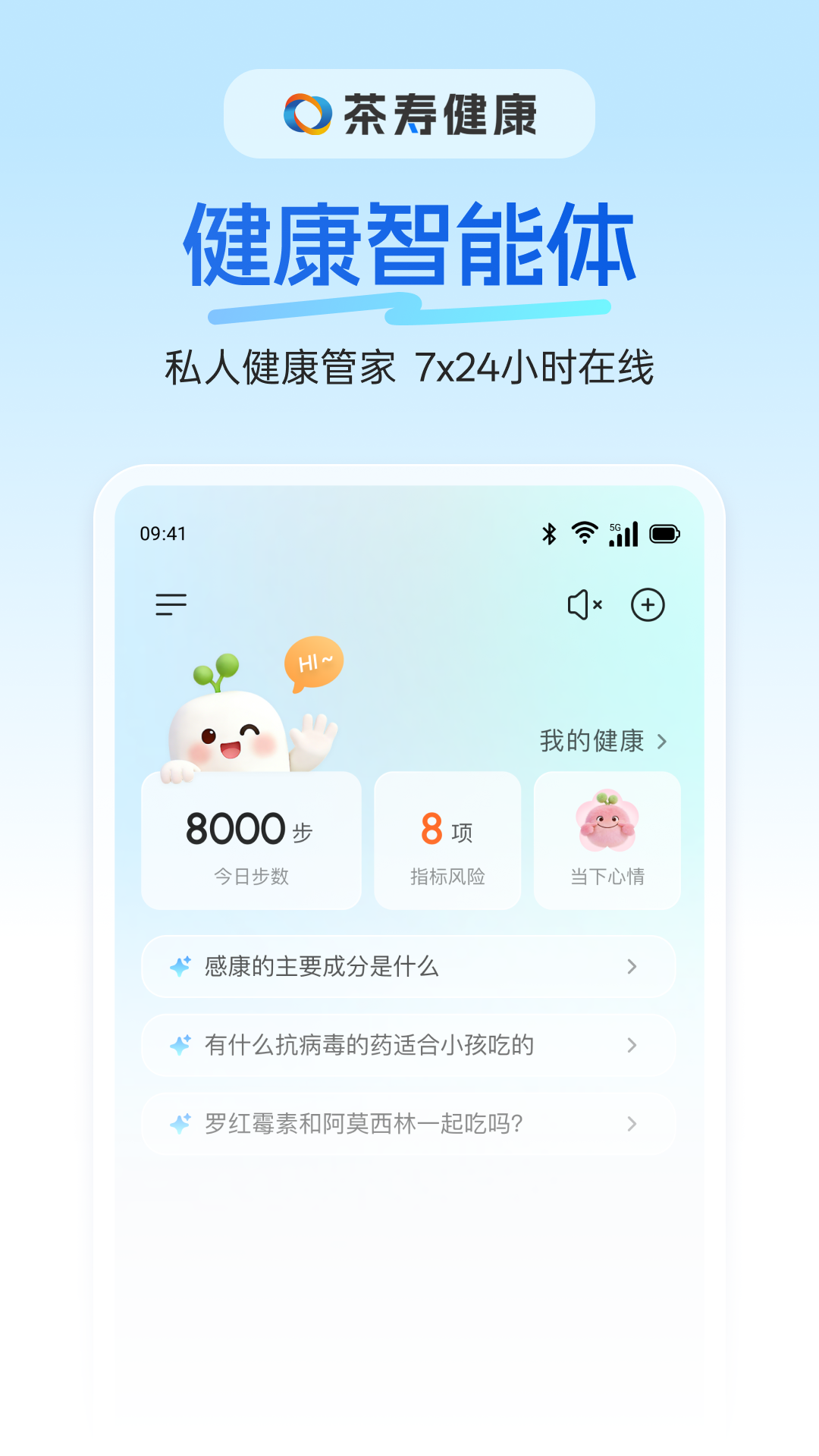 茶寿健康App是一款专为用户提供AI健康智能体服务的健康管家应用软件。我们以“AI管家,健康常伴”为核心理念,深度融合人工智能技术与健康管理服务,为全年龄段用户打造7×24小时在线的智能健康助手。平台通过AI健康智能体,为用户提供健康咨询、症状评估、报告解读、用药指导、饮食运动建议、慢病管理等全方位健康服务,让专业健康管理触手可及,成为每个家庭的专属AI健康管家。