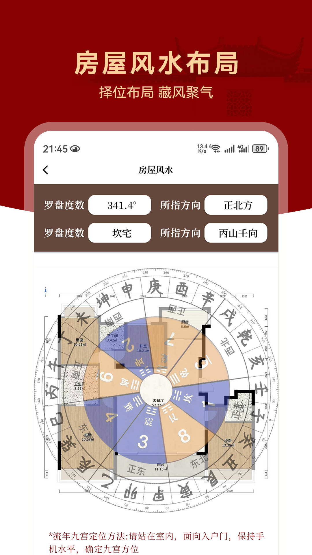提供罗盘功能,辅助测量房屋朝向、吉凶方位。集成八宅风水、玄空风水等流派知识,提供户型分析、布局建议、吉位催旺、凶位化解指导。