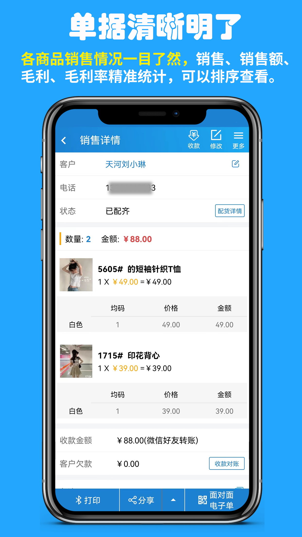 实时查看当日、当月、当年销售额、订单数、客单价。热销商品排行、滞销商品分析,帮助店主优化商品结构。利润统计,清楚知道赚了多少。