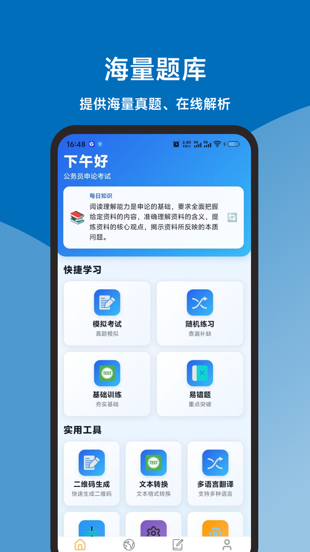 申论题库直通车App服务于公务员考生、事业单位考生及公考备考人群。用户免费下载使用,真题浏览、热点阅读等基础功能免费开放。部分模拟试卷、视频课程可能需要付费订阅。申论练习建议配合写作训练,效果更佳。如遇使用问题,可通过App内在线客服获取帮助。