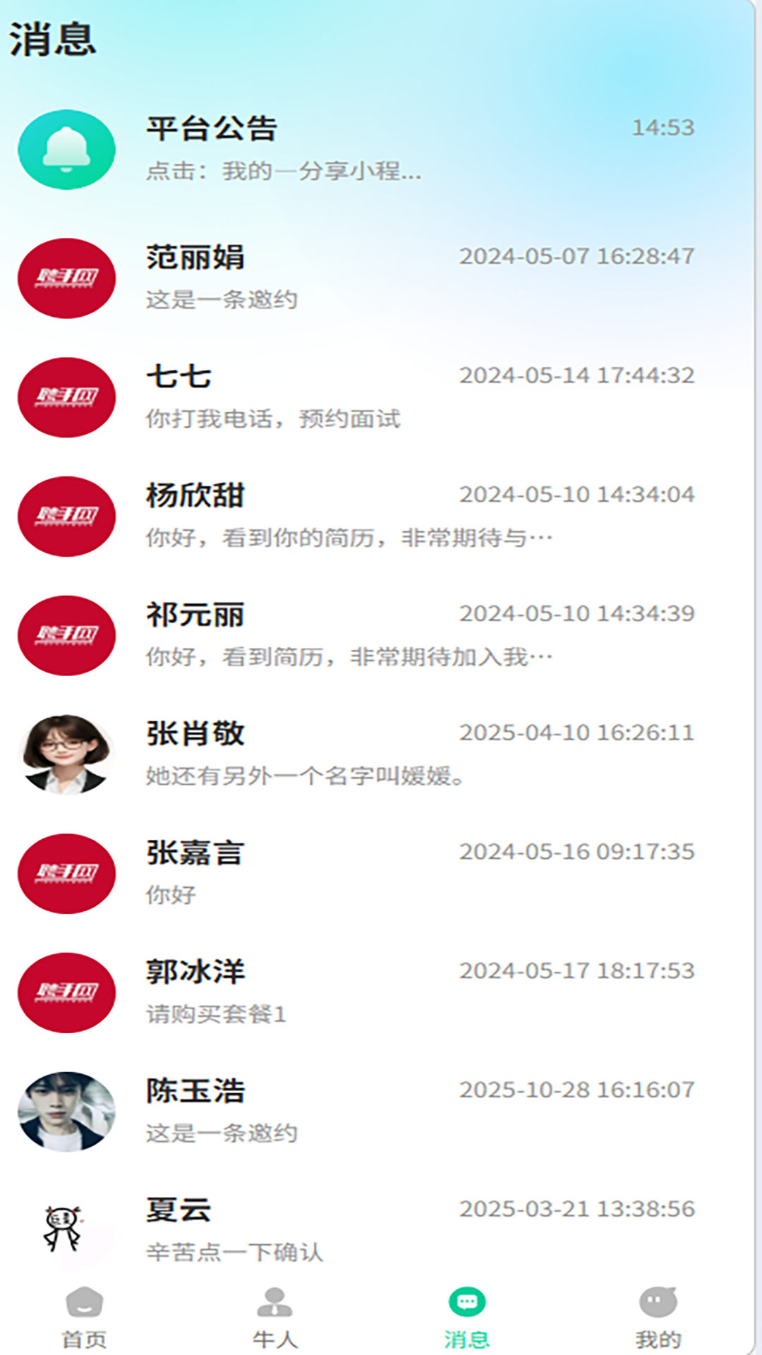 求职者与HR在线聊天,消息已读未读状态清晰,职位咨询薪资福利,面试邀约在线确认。