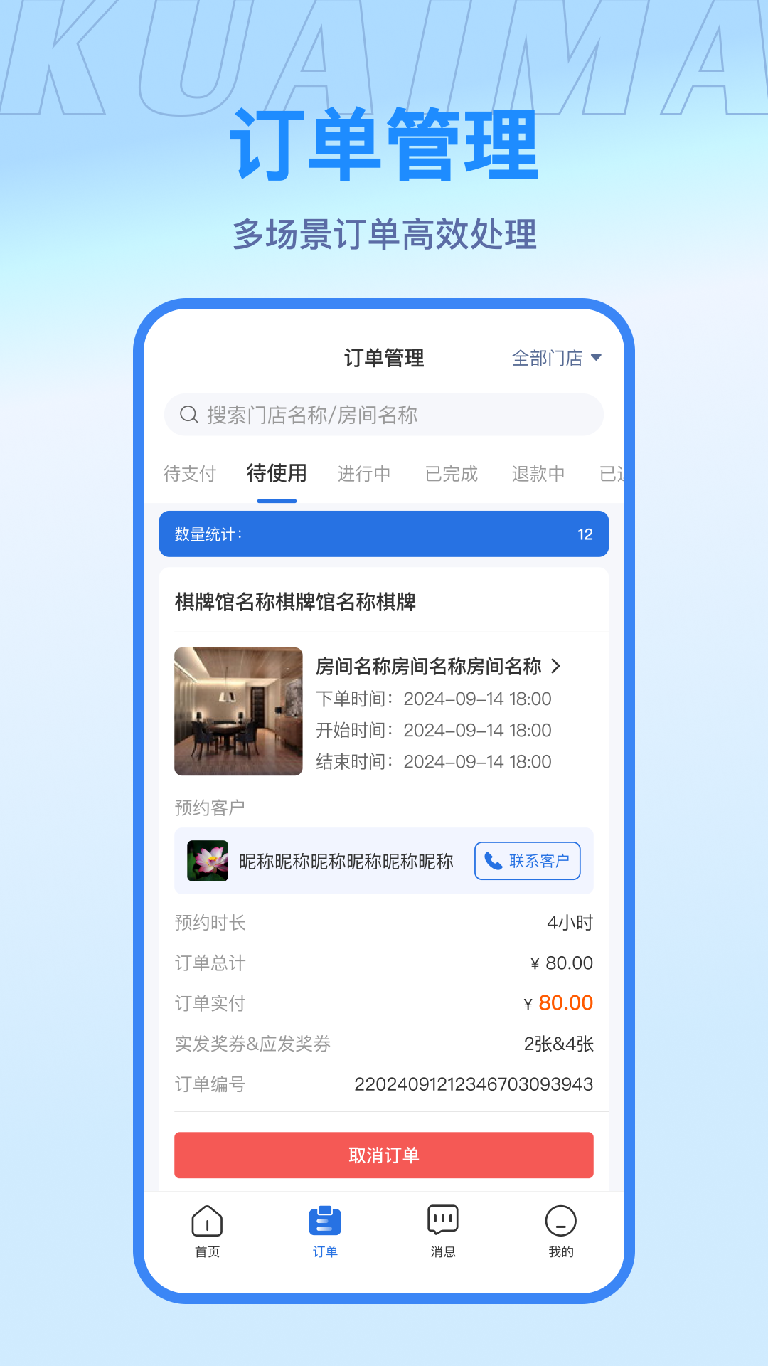 新订单实时提醒语音播报,一键接单拒单处理,订单小票自动打印,订单状态全程跟踪。